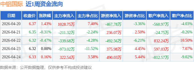 资金流向数据方面,本周中铝国际主力资金合计净流出172.72万元,游资资金合计净流入141.74万元,散户资金合计净流入30.99万元。本周资金流向一览见下表: