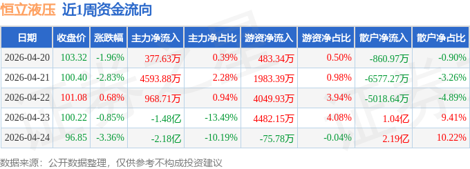 资金流向数据方面,本周恒立液压主力资金合计净流出3.07亿元,游资资金合计净流入1.09亿元,散户资金合计净流入1.98亿元。本周资金流向一览见下表:
