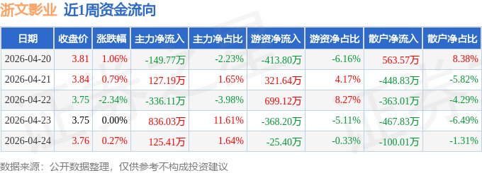 资金流向数据方面,本周浙文影业主力资金合计净流入602.75万元,游资资金合计净流入213.36万元,散户资金合计净流出816.11万元。本周资金流向一览见下表: