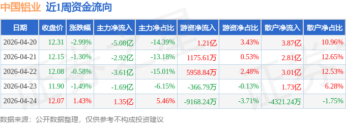 资金流向数据方面,本周中国铝业主力资金合计净流出11.96亿元,游资资金合计净流入9709.96万元,散户资金合计净流入10.99亿元。本周资金流向一览见下表:
