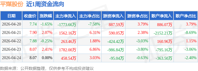证券之星消息,截至2026年4月24日收盘,平煤股份(601666)报收于8.07元,较上周的7.87元上涨2.54%。本周,平煤股份4月24日盘中最高价报8.12元。4月20日盘中最低价报7.67元。平煤股份当前最新总市值199.28亿元,在煤炭开采板块市值排名17/30,在两市A股市值排名1066/5200。