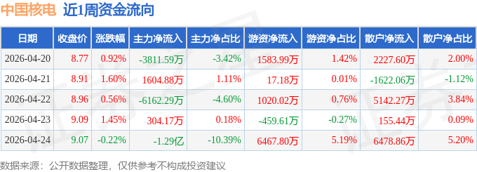 资金流向数据方面,本周中国核电主力资金合计净流出2.1亿元,游资资金合计净流入8629.39万元,散户资金合计净流入1.24亿元。本周资金流向一览见下表: