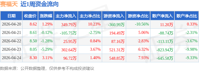 资金流向数据方面,本周赛福天主力资金合计净流入669.35万元,游资资金合计净流入990.82万元,散户资金合计净流出1660.17万元。本周资金流向一览见下表:
