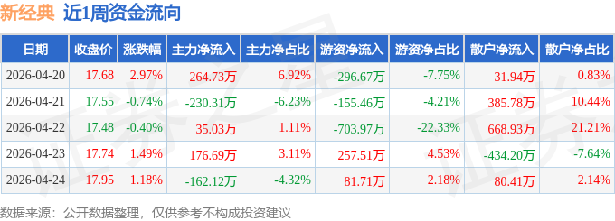 资金流向数据方面,本周新经典主力资金合计净流入84.02万元,游资资金合计净流出816.88万元,散户资金合计净流入732.86万元。本周资金流向一览见下表: