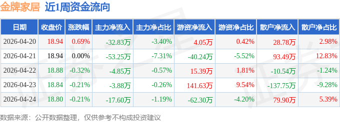 资金流向数据方面,本周金牌家居主力资金合计净流出112.41万元,游资资金合计净流入58.53万元,散户资金合计净流入53.88万元。本周资金流向一览见下表: