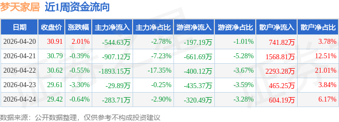 证券之星消息,截至2026年4月24日收盘,梦天家居(603216)报收于29.42元,较上周的30.3元下跌2.9%。本周,梦天家居4月20日盘中最高价报31.49元。4月24日盘中最低价报28.83元。梦天家居当前最新总市值65.52亿元,在家居用品板块市值排名17/72,在两市A股市值排名2821/5200。