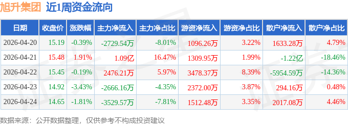资金流向数据方面,本周旭升集团主力资金合计净流入4407.73万元,游资资金合计净流入9769.06万元,散户资金合计净流出1.42亿元。本周资金流向一览见下表: