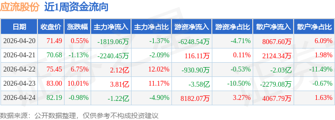 资金流向数据方面,本周应流股份主力资金合计净流入4.3亿元,游资资金合计净流出3.47亿元,散户资金合计净流出8281.76万元。本周资金流向一览见下表: