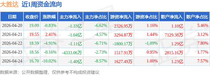 资金流向数据方面,本周大胜达主力资金合计净流出5.31亿元,游资资金合计净流入6967.05万元,散户资金合计净流入4.61亿元。本周资金流向一览见下表:
