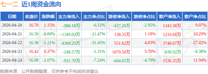 资金流向数据方面,本周七一二主力资金合计净流出7735.78万元,游资资金合计净流入727.63万元,散户资金合计净流入7008.15万元。本周资金流向一览见下表: