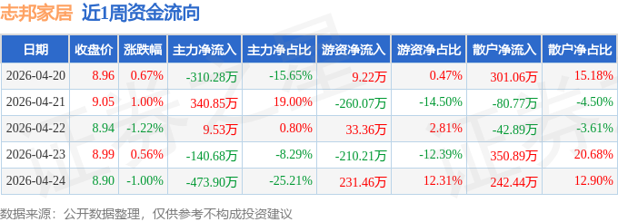 资金流向数据方面,本周志邦家居主力资金合计净流出574.49万元,游资资金合计净流出196.23万元,散户资金合计净流入770.72万元。本周资金流向一览见下表: