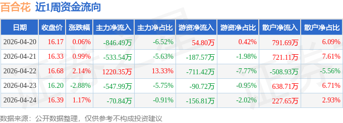 资金流向数据方面,本周百合花主力资金合计净流出778.51万元,游资资金合计净流出1091.72万元,散户资金合计净流入1870.23万元。本周资金流向一览见下表: