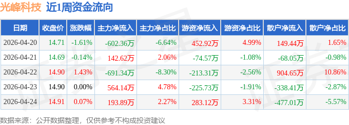 资金流向数据方面,本周光峰科技主力资金合计净流出393.05万元,游资资金合计净流入222.43万元,散户资金合计净流入170.62万元。本周资金流向一览见下表: