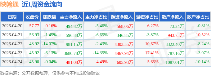 资金流向数据方面,本周映翰通主力资金合计净流出5272.55万元,游资资金合计净流入9598.62万元,散户资金合计净流出4326.07万元。本周资金流向一览见下表: