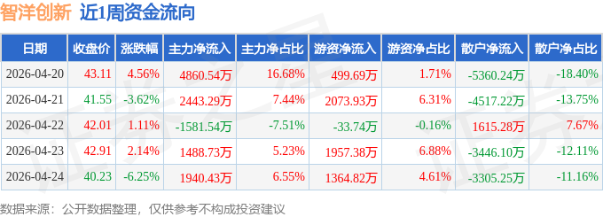 资金流向数据方面,本周智洋创新主力资金合计净流入9151.45万元,游资资金合计净流入5862.08万元,散户资金合计净流出1.5亿元。本周资金流向一览见下表: