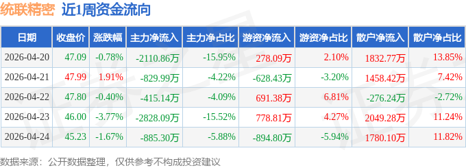 证券之星消息,截至2026年4月24日收盘,统联精密(688210)报收于45.23元,较上周的47.46元下跌4.7%。本周,统联精密4月21日盘中最高价报48.73元。4月24日盘中最低价报43.92元。统联精密当前最新总市值73.21亿元,在消费电子板块市值排名53/90,在两市A股市值排名2595/5200。