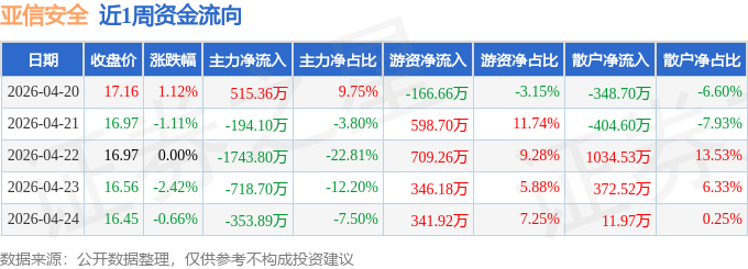 资金流向数据方面,本周亚信安全主力资金合计净流出2495.13万元,游资资金合计净流入1829.41万元,散户资金合计净流入665.72万元。本周资金流向一览见下表: