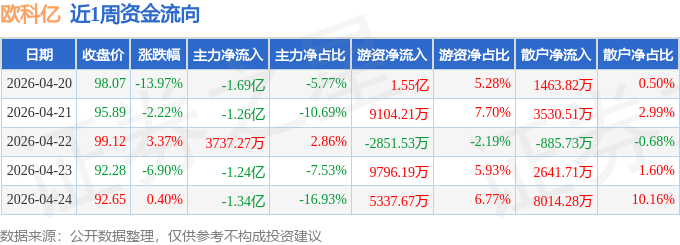 资金流向数据方面,本周欧科亿主力资金合计净流出5.16亿元,游资资金合计净流入3.69亿元,散户资金合计净流入1.48亿元。本周资金流向一览见下表: