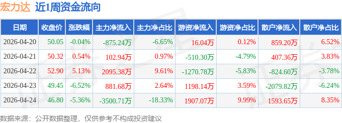 资金流向数据方面,本周宏力达主力资金合计净流出1295.95万元,游资资金合计净流入1340.17万元,散户资金合计净流出44.22万元。本周资金流向一览见下表: