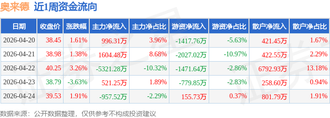 资金流向数据方面,本周奥来德主力资金合计净流出3156.76万元,游资资金合计净流出5540.55万元,散户资金合计净流入8697.31万元。本周资金流向一览见下表: