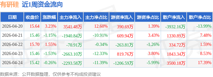 资金流向数据方面,本周有研硅主力资金合计净流出3426.95万元,游资资金合计净流入349.99万元,散户资金合计净流入3076.97万元。本周资金流向一览见下表: