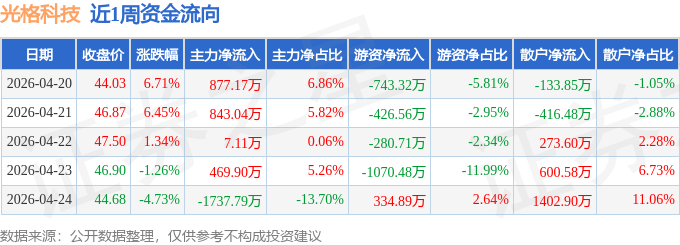 资金流向数据方面,本周光格科技主力资金合计净流入459.43万元,游资资金合计净流出2186.18万元,散户资金合计净流入1726.75万元。本周资金流向一览见下表: