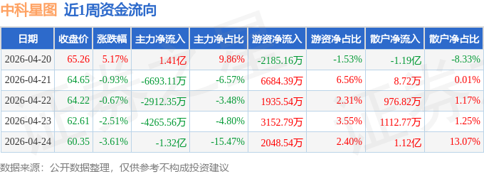 资金流向数据方面,本周中科星图主力资金合计净流出1.3亿元,游资资金合计净流入1.16亿元,散户资金合计净流入1341.2万元。本周资金流向一览见下表: