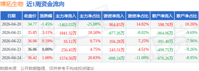 资金流向数据方面,本周博拓生物主力资金合计净流入2243.84万元,游资资金合计净流出311.08万元,散户资金合计净流出1932.77万元。本周资金流向一览见下表: