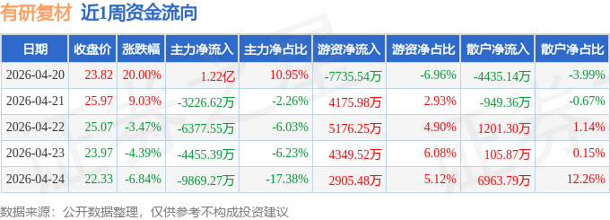 资金流向数据方面,本周有研复材主力资金合计净流出1.18亿元,游资资金合计净流入8871.7万元,散户资金合计净流入2886.45万元。本周资金流向一览见下表: