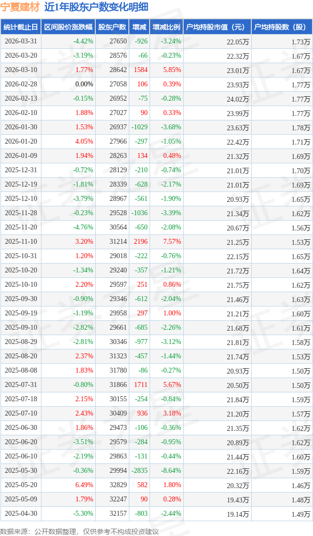 从股价来看,2026年3月20日至2026年3月31日,宁夏建材区间跌幅为4.42%,在此期间股东户数减少926.0户,减幅为3.24%。