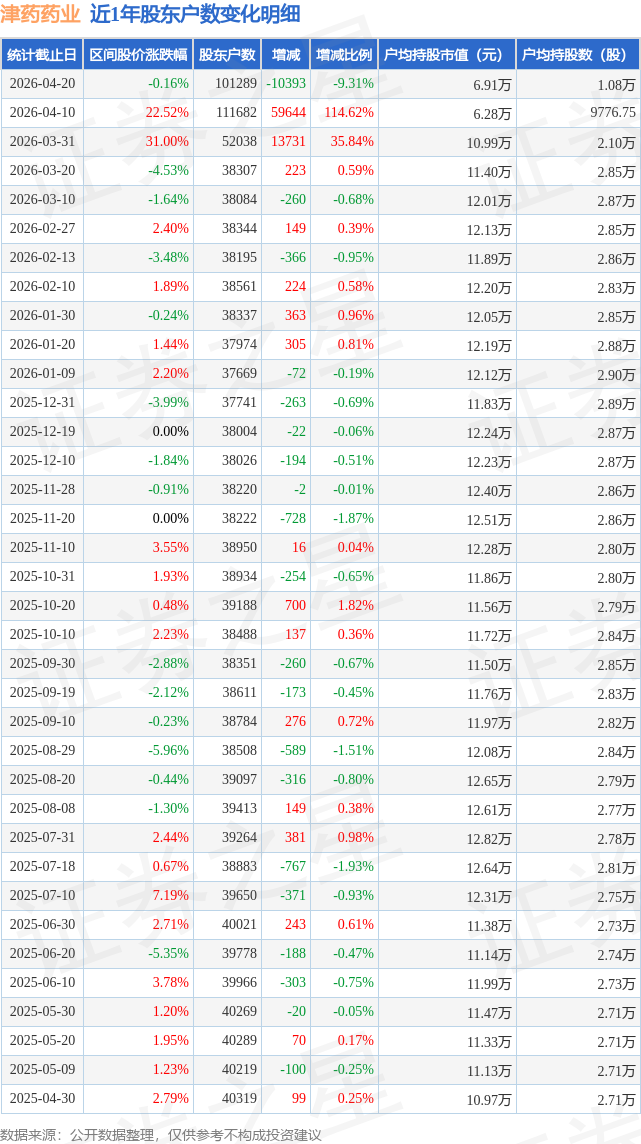 从股价来看,2026年4月10日至2026年4月20日,津药药业区间跌幅为0.16%,在此期间股东户数减少1.04万户,减幅为9.31%。