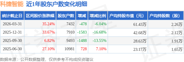 从股价来看,2025年12月31日至2026年3月31日,科捷智能区间涨幅为35.24%,在此期间股东户数减少478.0户,减幅为6.04%。