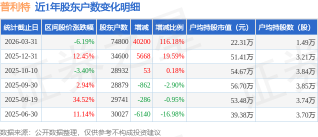 从股价来看,2025年12月31日至2026年3月31日,普利特区间跌幅为6.19%,在此期间股东户数增加4.02万户,增幅为116.18%。