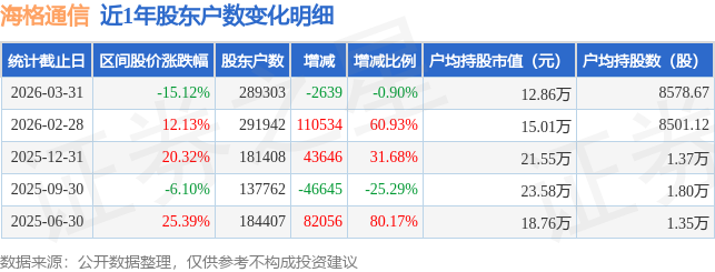 从股价来看,2026年2月28日至2026年3月31日,海格通信区间跌幅为15.12%,在此期间股东户数减少2639.0户,减幅为0.9%。