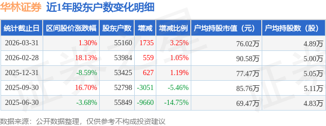 证券之星消息,近日华林证券披露,截至2026年3月31日公司股东户数为5.52万户,较12月31日增加1735.0户,增幅为3.25%。户均持股数量由上期的5.0万股减少至4.89万股,户均持股市值为76.02万元。