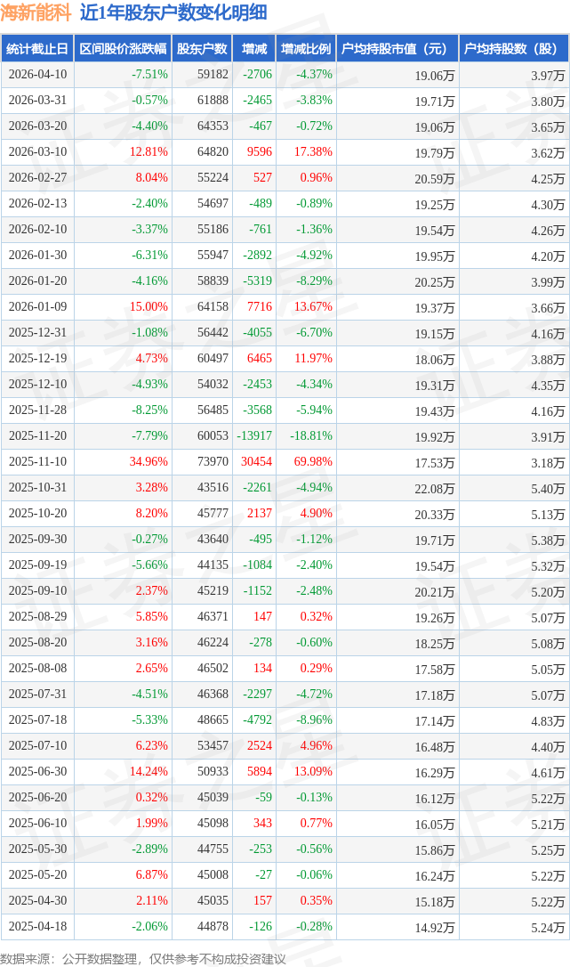 证券之星消息,近日海新能科披露,截至2026年4月10日公司股东户数为5.92万户,较3月31日减少2706.0户,减幅为4.37%。户均持股数量由上期的3.8万股增加至3.97万股,户均持股市值为19.06万元。