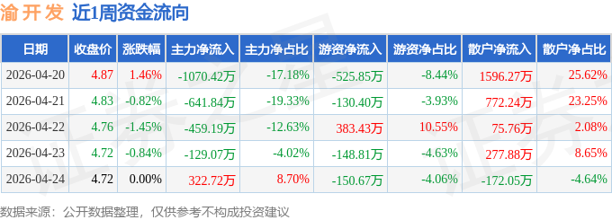 资金流向数据方面,本周渝 开 发主力资金合计净流出1977.81万元,游资资金合计净流出572.29万元,散户资金合计净流入2550.1万元。本周资金流向一览见下表: