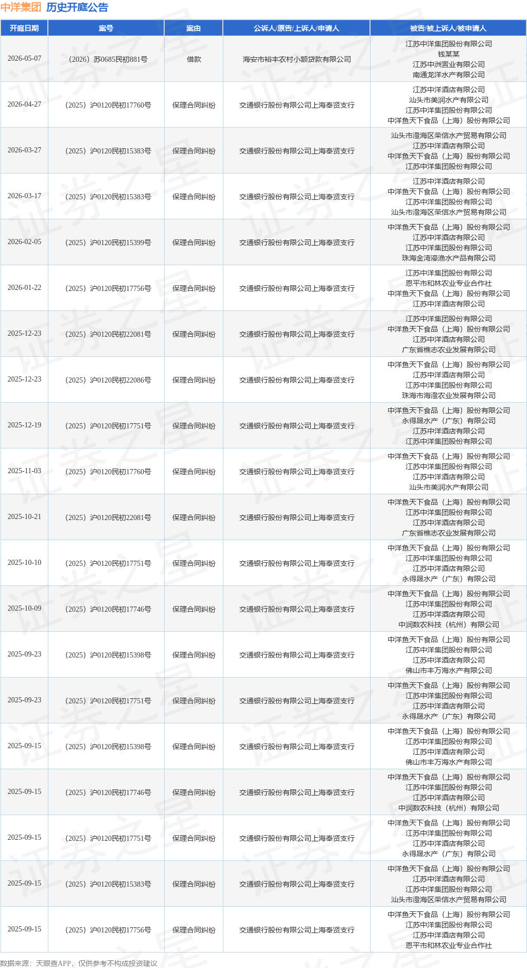 案号:(2025)沪0120民初17760号根据统计,近一年内以江苏中洋集团股份有限公司为当事人的历史开庭公告有47则,其中案由为“保理合同纠纷”的公告以25则居首,其次为“追偿权纠纷”有17则,“买卖合同纠纷”有1则。历史开庭公告(前20条)如下: