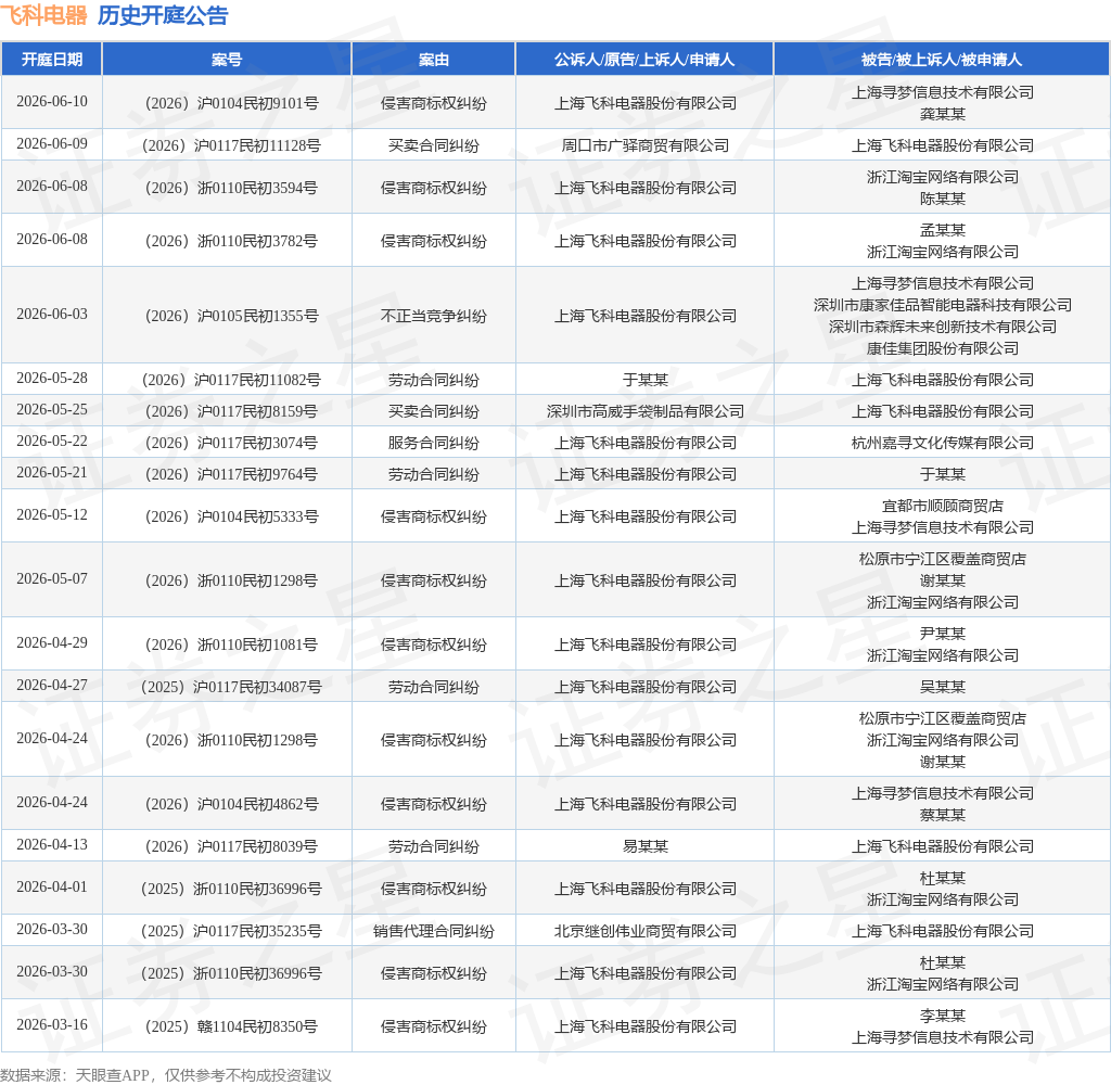 案号:(2025)沪0117民初34087号根据统计,近一年内以上海飞科电器股份有限公司为当事人的历史开庭公告有173则,其中案由为“侵害商标权纠纷”的公告以119则居首,其次为“劳动合同纠纷”有11则,“侵害外观设计专利权纠纷”有11则。历史开庭公告(前20条)如下: