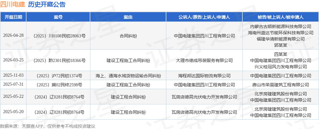 案号:(2025)川0108民初28063号根据统计,近一年内以中国电建集团四川工程有限公司为当事人的历史开庭公告有6则,其中案由为“建设工程合同纠纷”的公告以2则居首,其次为“建设工程施工合同纠纷”有2则,“合同纠纷”有1则。历史开庭公告如下:
