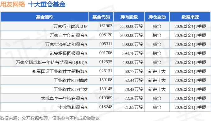 持有用友网络最多的基金为万家行业优选LOF,目前规模为58.28亿元,最新净值1.4372(4月24日),较上一交易日上涨1.63%,近一年上涨24.43%。该基金现任基金经理为黄兴亮。