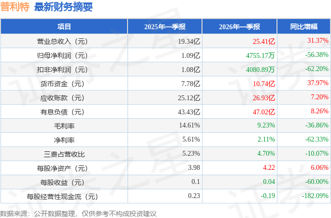 据证券之星公开数据整理,近期普利特(002324)发布2026年一季报。截至本报告期末,公司营业总收入25.41亿元,同比上升31.37%,归母净利润4755.17万元,同比下降56.38%。按单季度数据看,第一季度营业总收入25.41亿元,同比上升31.37%,第一季度归母净利润4755.17万元,同比下降56.38%。本报告期普利特公司应收账款体量较大,当期应收账款占最新年报归母净利润比达732.82%。