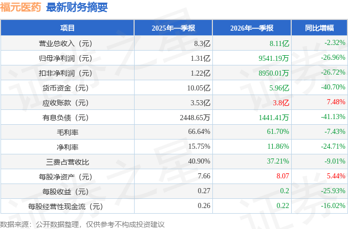 据证券之星公开数据整理,近期福元医药(601089)发布2026年一季报。根据财报显示,福元医药净利润同比下降26.96%。截至本报告期末,公司营业总收入8.11亿元,同比下降2.32%,归母净利润9541.19万元,同比下降26.96%。按单季度数据看,第一季度营业总收入8.11亿元,同比下降2.32%,第一季度归母净利润9541.19万元,同比下降26.96%。