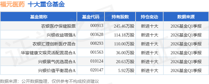 持有福元医药最多的基金为农银医疗保健股票,目前规模为11.42亿元,最新净值1.592(4月24日),较上一交易日下跌0.12%,近一年上涨4.41%。该基金现任基金经理为梦圆。