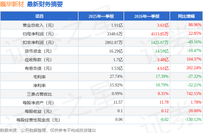 据证券之星公开数据整理,近期巍华新材(603310)发布2026年一季报。截至本报告期末,公司营业总收入3.61亿元,同比上升88.96%,归母净利润4113.85万元,同比上升22.85%。按单季度数据看,第一季度营业总收入3.61亿元,同比上升88.96%,第一季度归母净利润4113.85万元,同比上升22.85%。本报告期巍华新材应收账款上升,应收账款同比增幅达104.37%。