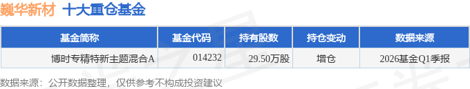 持有巍华新材最多的基金为博时专精特新主题混合A,目前规模为2.03亿元,最新净值1.4903(4月24日),较上一交易日下跌0.01%,近一年上涨56.54%。该基金现任基金经理为刘玉强。