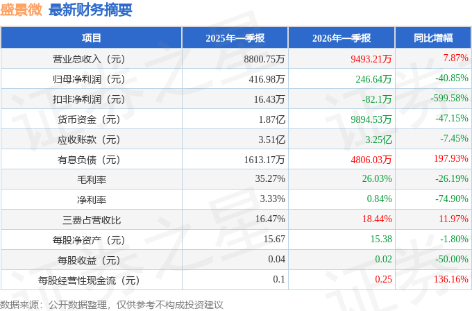 据证券之星公开数据整理,近期盛景微(603375)发布2026年一季报。截至本报告期末,公司营业总收入9493.21万元,同比上升7.87%,归母净利润246.64万元,同比下降40.85%。按单季度数据看,第一季度营业总收入9493.21万元,同比上升7.87%,第一季度归母净利润246.64万元,同比下降40.85%。本报告期盛景微公司应收账款体量较大,当期应收账款占最新年报归母净利润比达3213.06%。