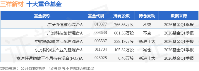 持有三祥新材最多的基金为广发价值核心混合A,目前规模为28.6亿元,最新净值1.1435(4月24日),较上一交易日下跌0.5%,近一年上涨58.36%。该基金现任基金经理为吴远怡。