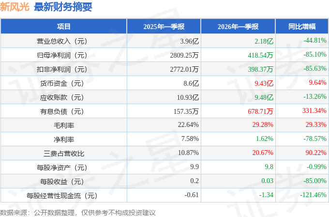 据证券之星公开数据整理,近期新风光(688663)发布2026年一季报。截至本报告期末,公司营业总收入2.18亿元,同比下降44.81%,归母净利润418.54万元,同比下降85.1%。按单季度数据看,第一季度营业总收入2.18亿元,同比下降44.81%,第一季度归母净利润418.54万元,同比下降85.1%。本报告期新风光三费占比上升明显,财务费用、销售费用和管理费用总和占总营收同比增幅达90.22%。