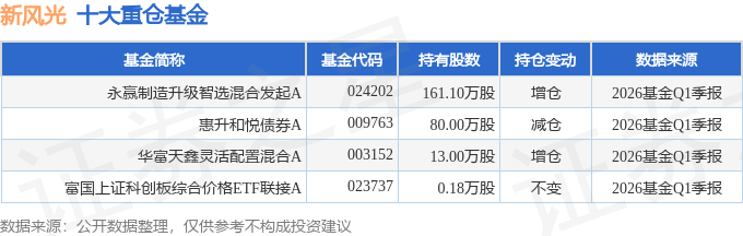 持有新风光最多的基金为永赢制造升级智选混合发起A,目前规模为2.93亿元,最新净值1.3728(4月24日),较上一交易日下跌1.69%。该基金现任基金经理为胡泽。